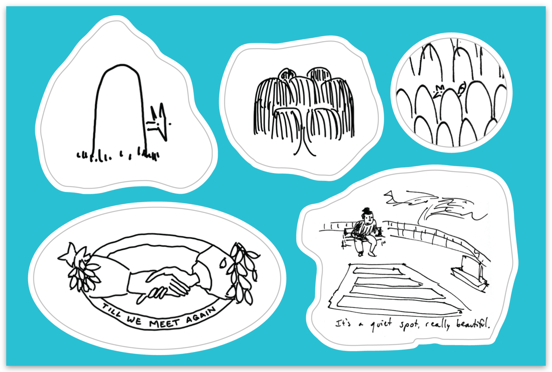 Sheet of 5 stickers from Cemetery Maps Volume 2: -fox behind tombstone -weeping willow symbol -fox in cemetery -handshake symbol -Jonestown Memorial moment